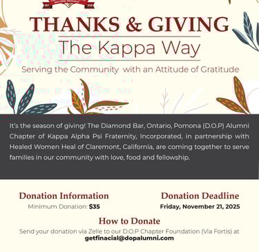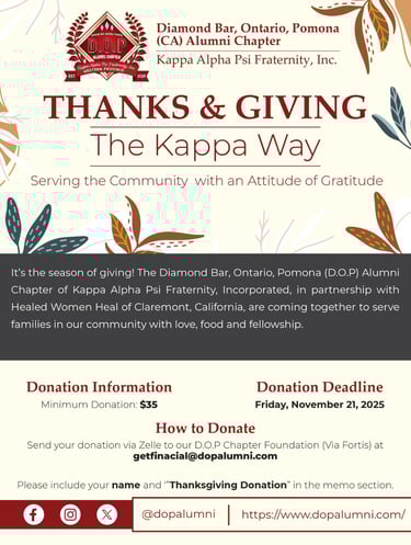 On February 14, 2015, a small group of Kappa Alpha Psi undergraduate initiated members had been meeting to form an Alumni Klub in the Diamond Bar, Ontario, Pomona area in the Inland Empire. The overall objectives of these meetings are to charter a new alumni chapter of Kappa Alpha Psi Fraternity, Inc. and to provide services to the community in which they lived.